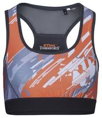 Il reggiseno sportivo STIHL presenta una stampa integrale in grigio, arancione e bianco sul davanti e sui lati. È composto per l'86% da poliestere e per il 14% da elastan. È realizzato in materiale traspirante e ad asciugatura rapida. Presenta una stampa "STIHL TIMBERSPORTS" sul davanti.